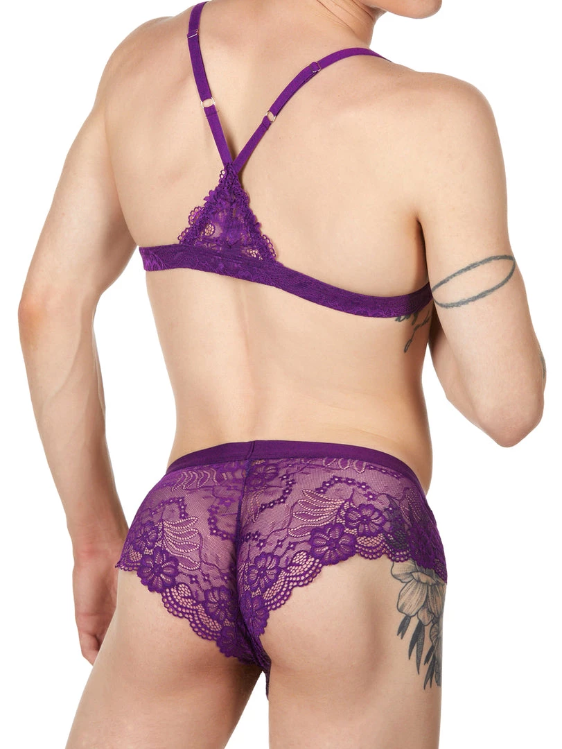 Beautiful lace and delicate detailing come together in the Valentina Lace Bra for guys. The scalloped lace cups are slightly shaped with a center seam, and the bra will fit perfectly on your manly chest because of the sturdy 1″ lace-covered elastic band under the cups. With narrow adjustable criss-cross bra straps in back. Easy to slip into, easy to wear and easy on the eyes!