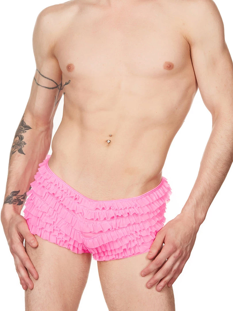 Flirty, feminine, and fabulous unisex panty! Layers upon layers of soft mesh ruffles make these frilly panties a must-have. Features a cheeky back and matching bow. The front has a split seam with enough give to provide room for your shape. The fit is lowrise and sits nicely on the hips.