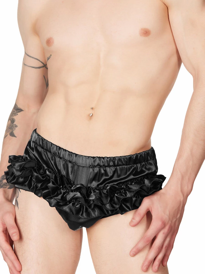 The cutest stretch Satin Ruffle Panty for you! Made from shinning stretch satin with a playful band of ruffles around the center front and back. A comfy elastic band wrapped in satin for a comfy and secure fit. Nice roomy pouch and a full-coverage back. Along with a ruffled edge at the leg opening.