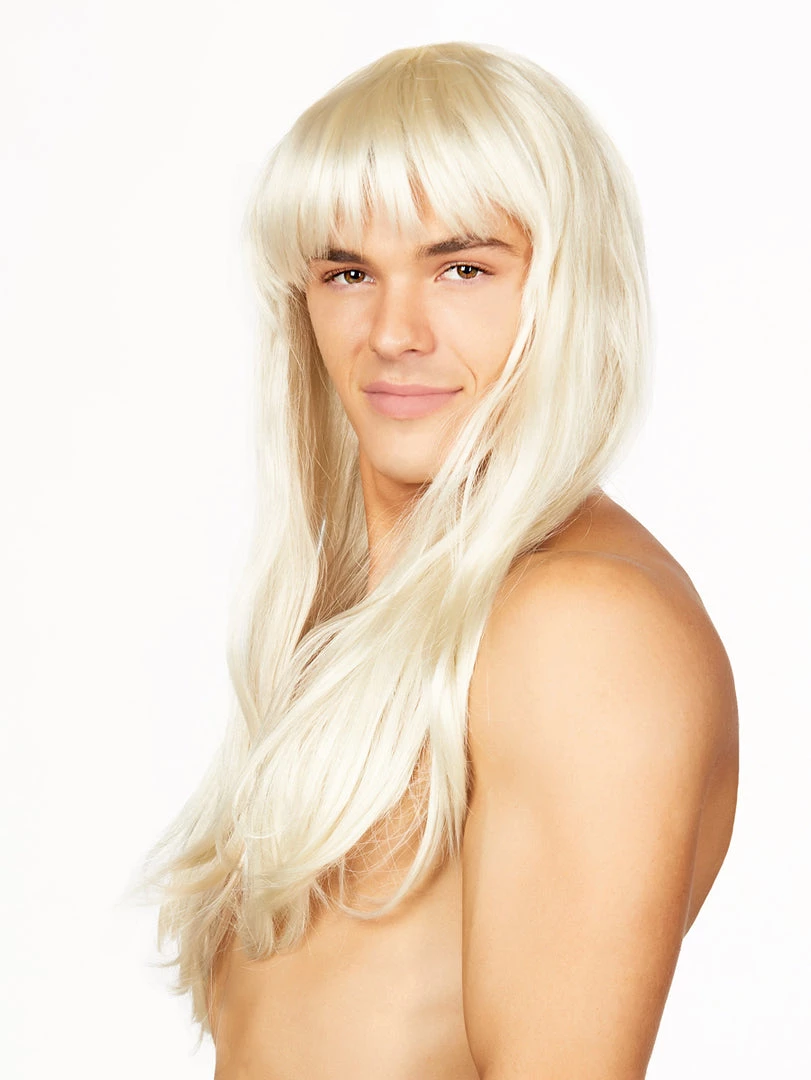 Long-length blonde wig with fringy ends and cute bangs. We think this style looks great with any of our cosplay costumes, and most certainly with the school-girl costumes! One size fits most.