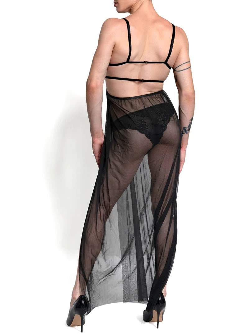 Feeling a bit goth? This unisex mesh gown with an elastic cage harness bodice sends out a sense of poise and mystery for your next look. Made from flowing mesh and two front leg slits for ease of movement. Adjustable straps at the back and two secure lingerie hooks on each horizontal back strap.