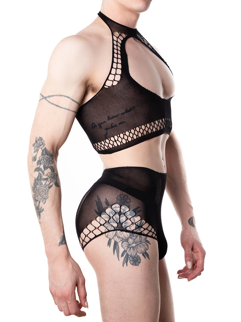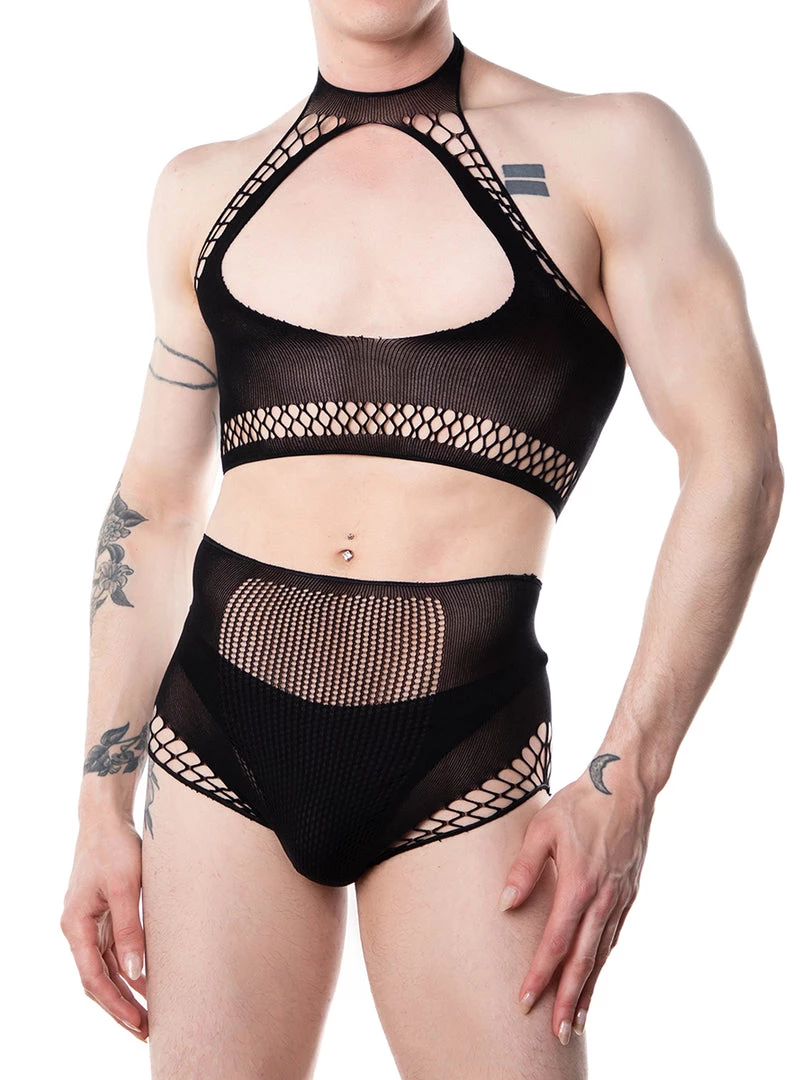 It’s a party while wearing this set! Stretchy fishnet and mesh hug your body for dancing all night long. Includes a halter cropped top and high-waisted bottoms. Opt for wearing a panty underneath or nothing at all. One size fits most, see size chart below.