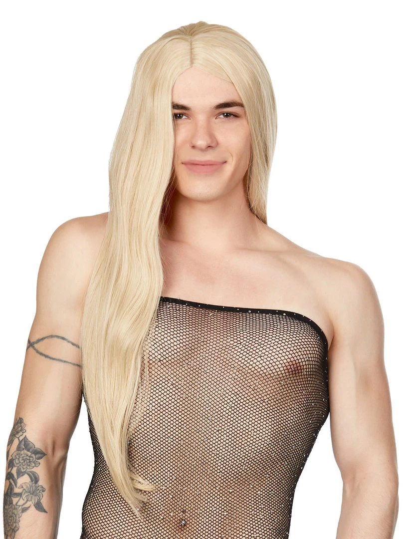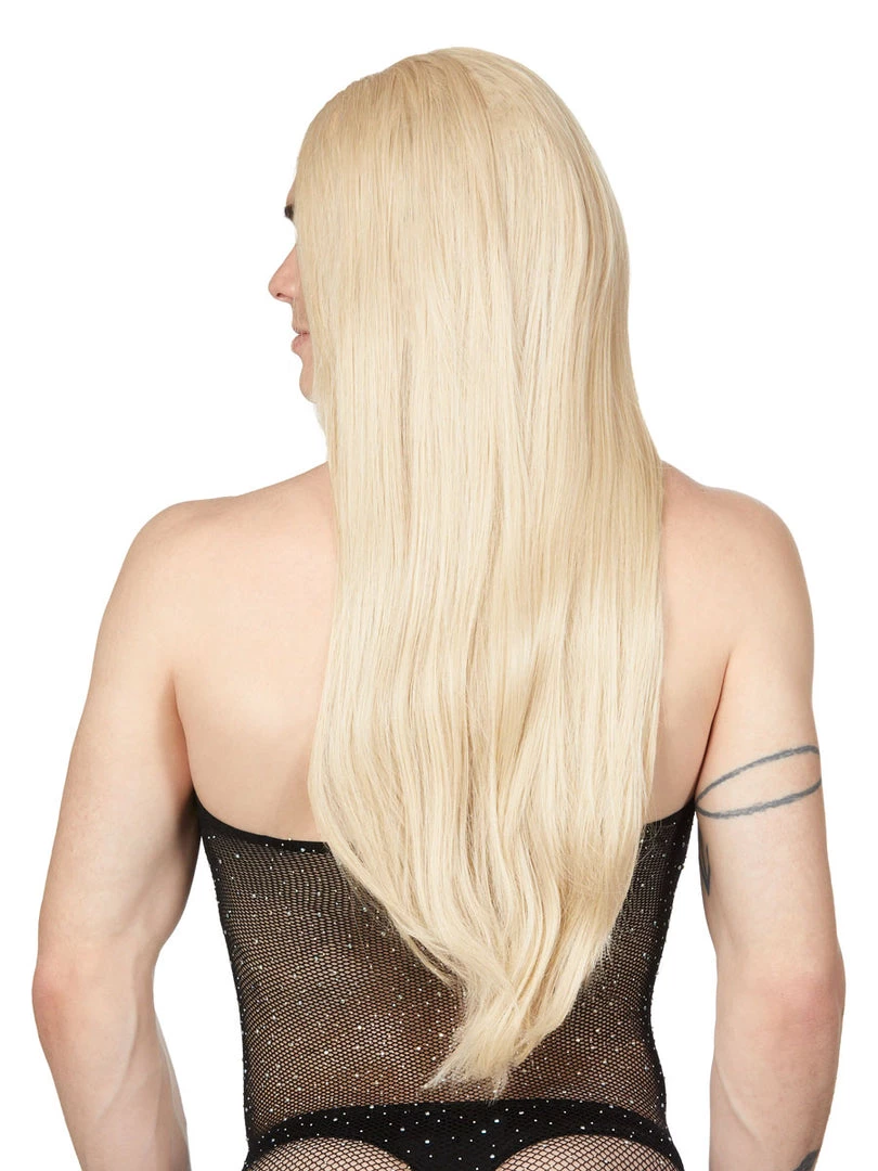 Long-length blonde wig with a center part. We think this style looks great with any of our cosplay costumes, and most certainly with the school-girl costumes! One size fits most.
