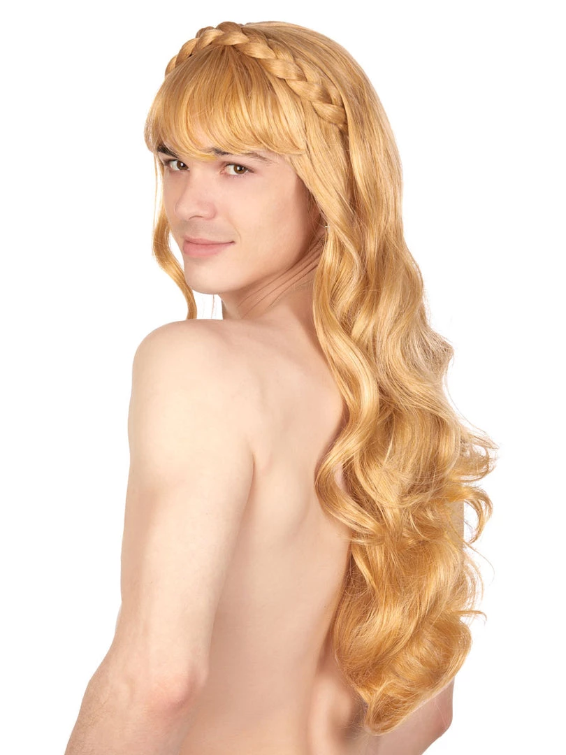 Long Golden Blonde wig with natural cascading waves. Features a fringe and braided headband. This style looks great with any of our cosplay costumes!