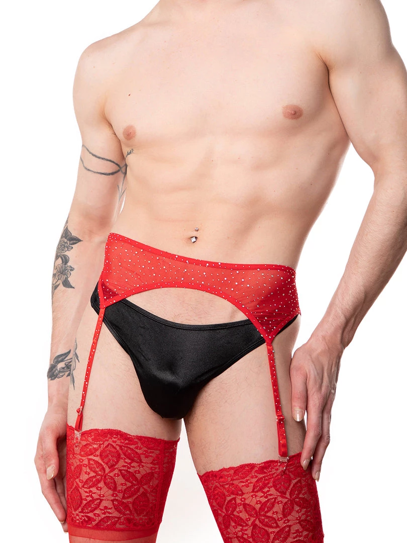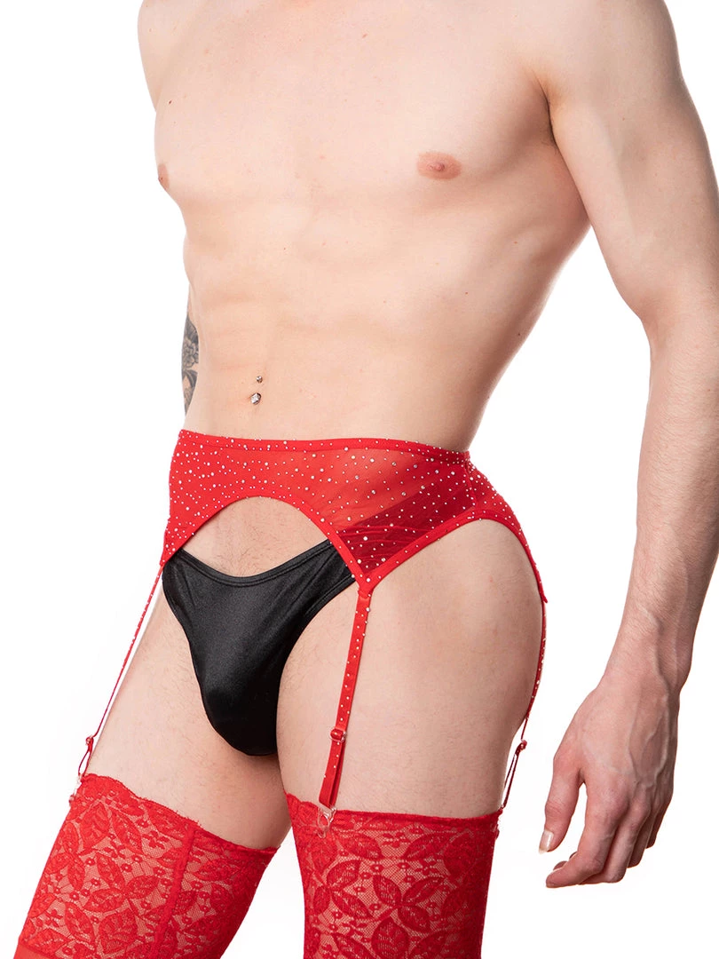 A unisex dazzling red mesh garter belt! This stellar piece adds a dash of bling to your look. Studded in crystals over stretch mesh fabric. Easy step-in design and four adjustable garter straps. Match it with the stockings here!