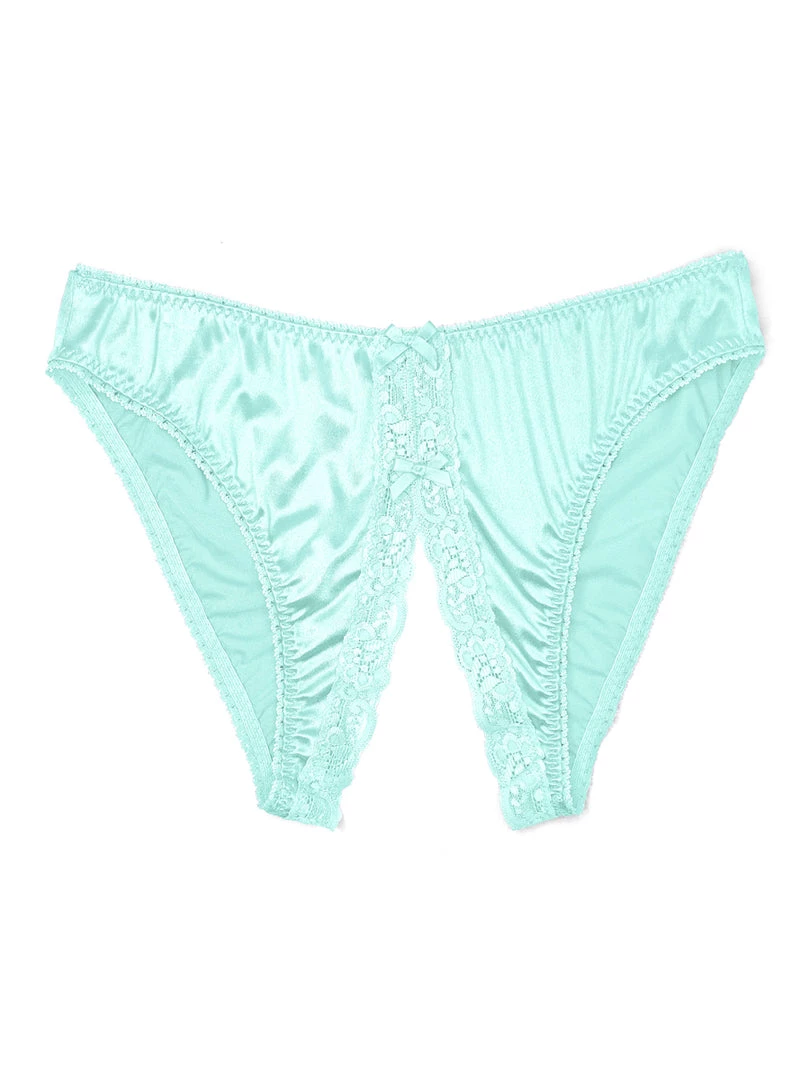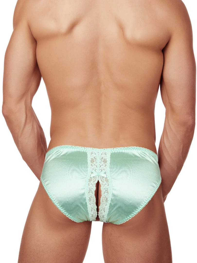 These Shimmering Satin Panties will give you eye-catching appeal in our signature crotchless panty for men. Made from rich stretch satin with matching lace picot elastic at waist and leg. We’ve accentuated the lace-trimmed front-to-back opening with a few delicate satin bows (two in the front and one in the back)! Lace-trimmed opening from front to back.