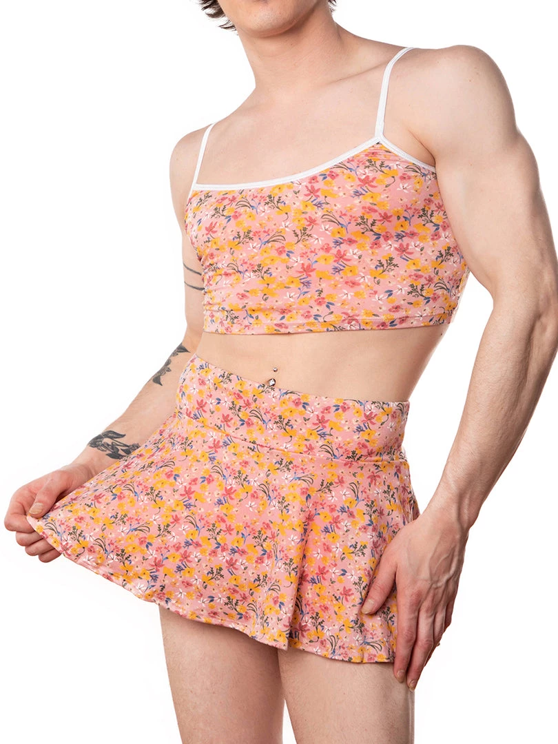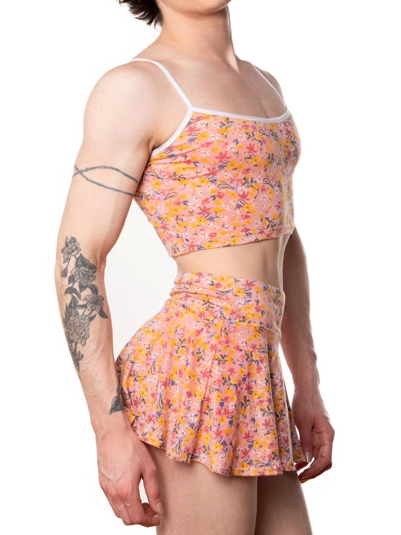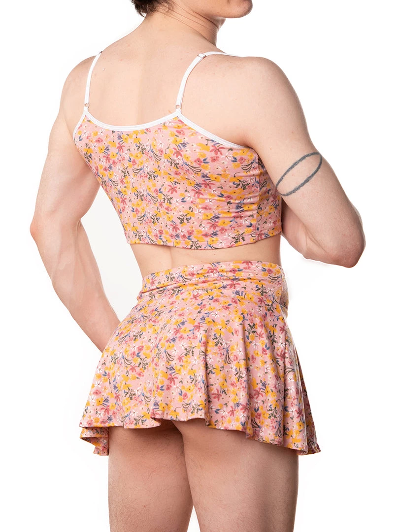An adorable crop top to pair with our matching skirt, thong, or panty. Made from our signature soft-touch sueded fabric in an updated ditzy floral print. Bare your midriff and have your chest look spectacular. Contrasting white trim and two adjustable straps for the perfect fit.