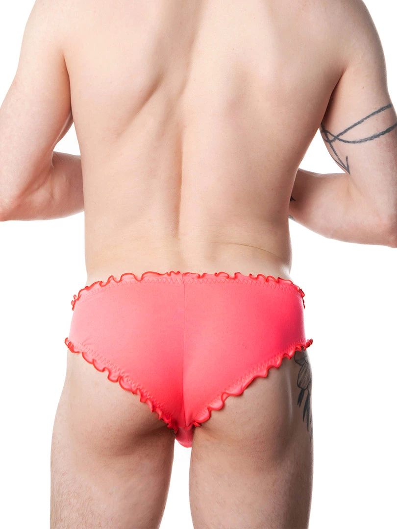 Showcase your precious parts in the Frilly Panty! Made from a very lightweight plush fabric, these briefs feel soft to the touch and feel great down there. Invisible elastication around waist and leg, and finished with a contrasting rolled hem edge.
